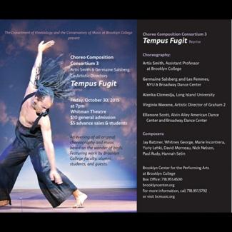 "Tempus Fugit Reprise.” Professor Artis Smith and Germaine Salsberg, in collaboration with composition faculty and students, present an evening of original choreography to original music: new movement to new sounds as dancers take flight. This is an updated edition of the original collaborative work created as part of the International Electroacoustic Music Festival, George Brunner, Director.